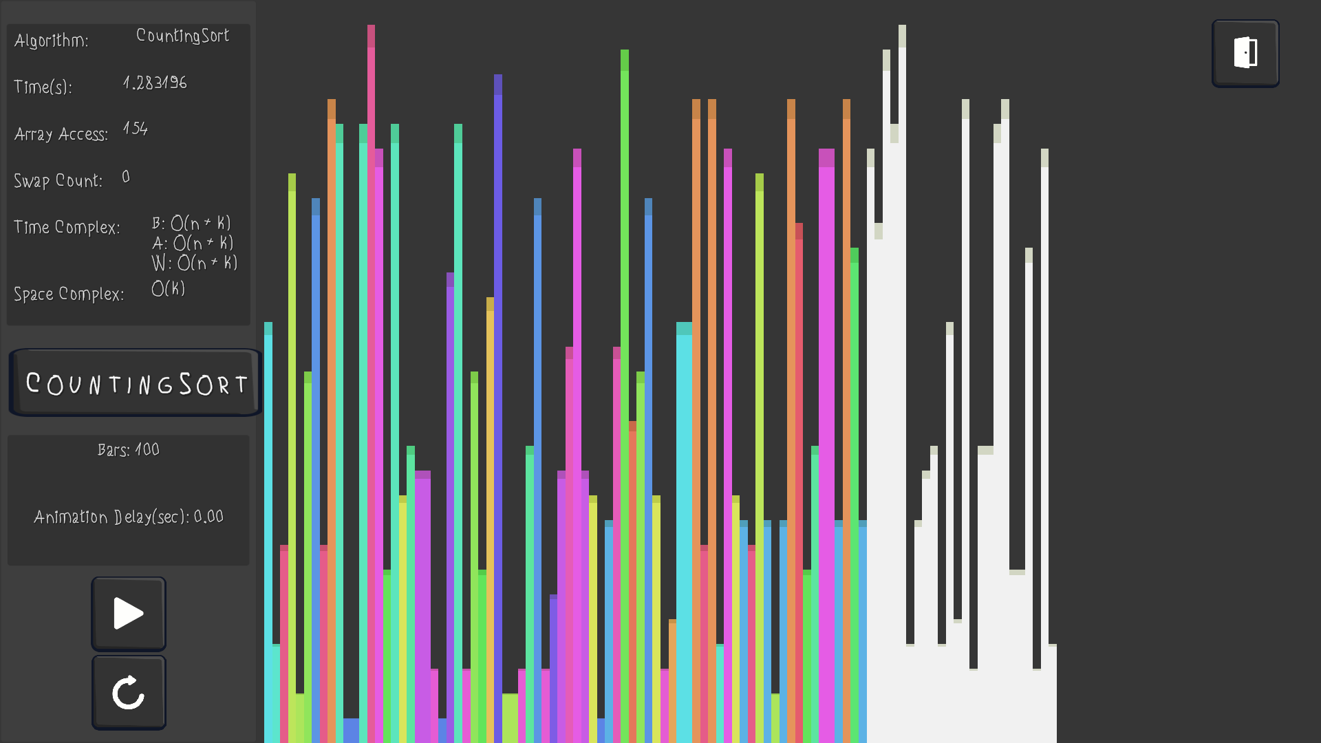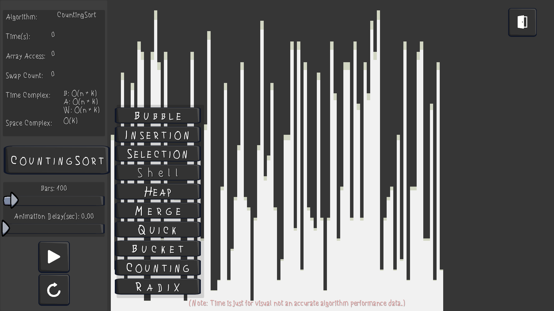-Also control animation time to control the speed of visualization, keep at 0 to get as accurate result as possible, although because of visuals and UI the speed of algorithm in this case will never be the final accurate data, hence this project is meant only for education or just curiosity purposes.